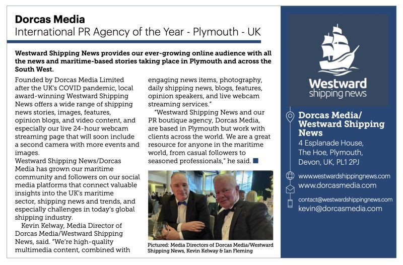 The international award once again highlights Westward Shipping News website and services, and Dorcas Media – for International PR Agency of the Year – Plymouth, UK, 2026.